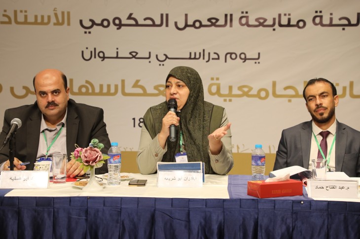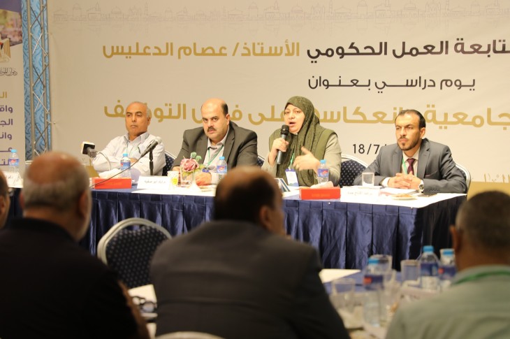 في الجلسة الأولى التي ترأسها أ. محمد طبيل مدير عام التشغيل في وزارة العمل، تحدث د. علي أبو سعدة من وزارة التربية والتعليم عن واقع التخصصات الجامعية في مؤسسات التعليم العالي في قطاع غزة، فيما استعرض م. إياد أبو صفية أهم التحديات التي يواجهها ديوان الموظفين العام في التخصصات الجامعية، مع تطرق م. أحمد النبريص من وزارة العمل عبر ورقته العلمية إلى واقع الخريجين في سوق العمل.